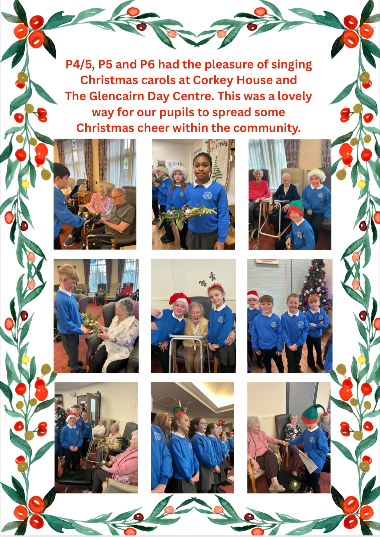 P4/5, P5 and P6 had a fabulous time singing carols and spreading Christmas cheer at Corkey House and Glencairn Day Centre. This was a lovely way for the pupils to spend the afternoon. Thank you for having us!
